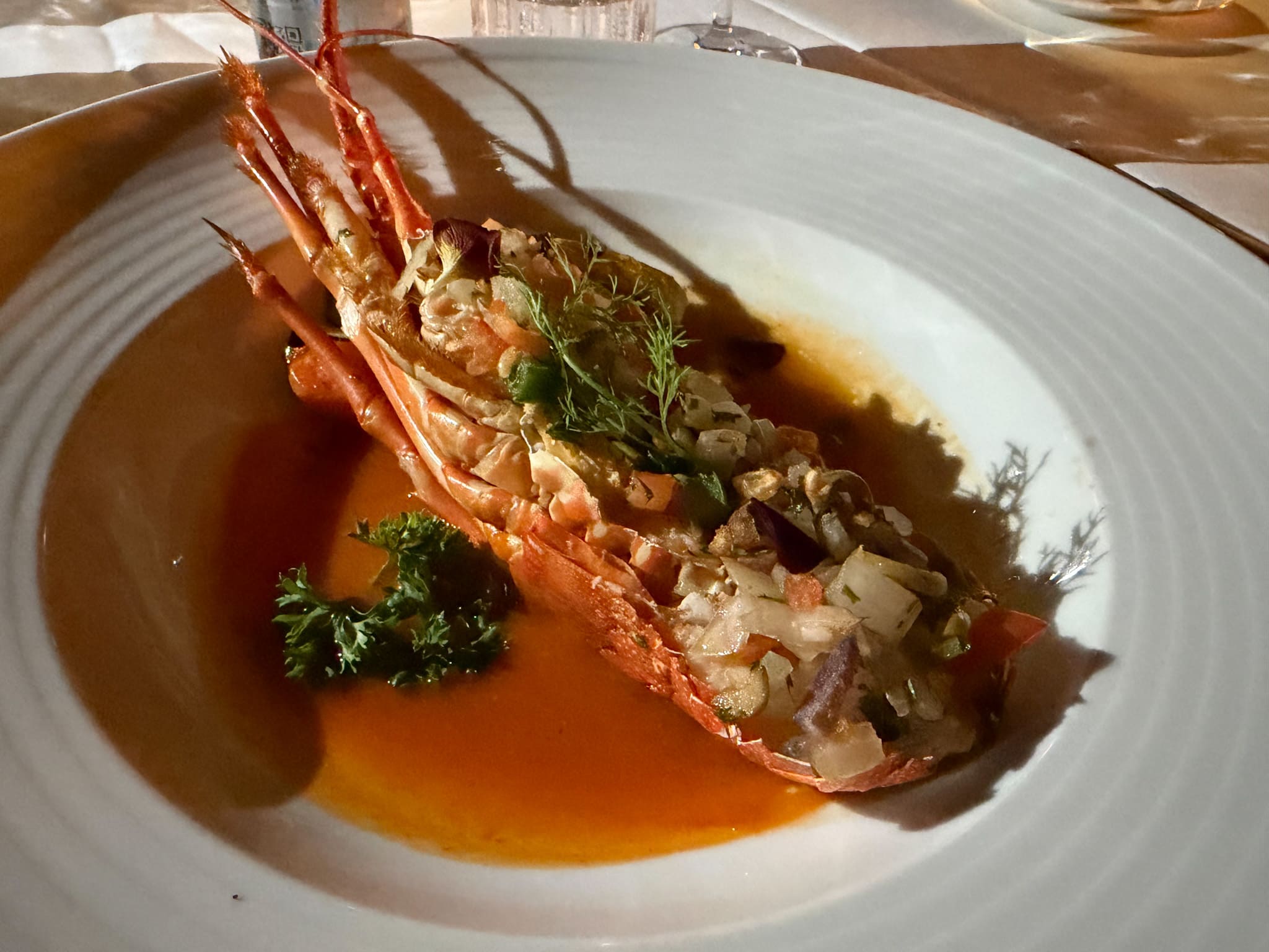 Dopo lo spettacolo, inizia la cena degustazione, un percorso gastronomico pensato per raccontare i sapori del Vietnam con un tocco internazionale. Il menu si apre con gamberi scottati al burro, accompagnati da un’insalatina di avocado con salsa al mango, fresca e profumata. A seguire, una crema di zucca infusa all’olio di tartufo, vellutata e avvolgente.