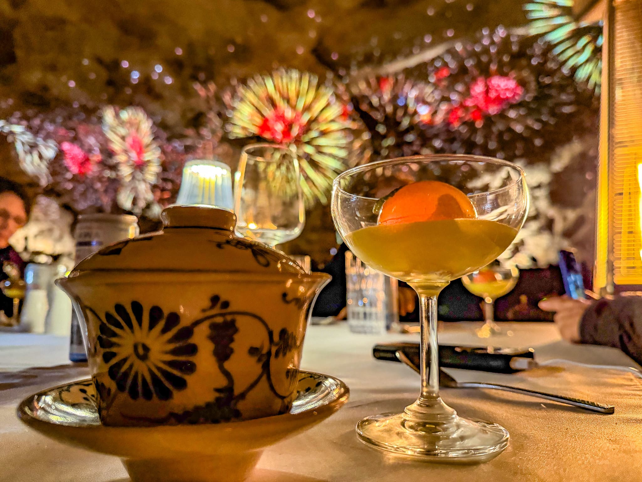 Il tè in Vietnam è un linguaggio di cortesia e rispetto. Si offre agli ospiti, si condivide tra amici, accompagna le attese e le conversazioni. Anche qui, prima che inizi la cena, è lui a fare gli onori di casa. Nessun brindisi rumoroso, nessun bicchiere tintinnante: solo il vapore che sale lento dalla tazza e prepara i sensi a ciò che verrà dopo. Una semplicità che, in un contesto così spettacolare, diventa parte stessa della magia della serata.