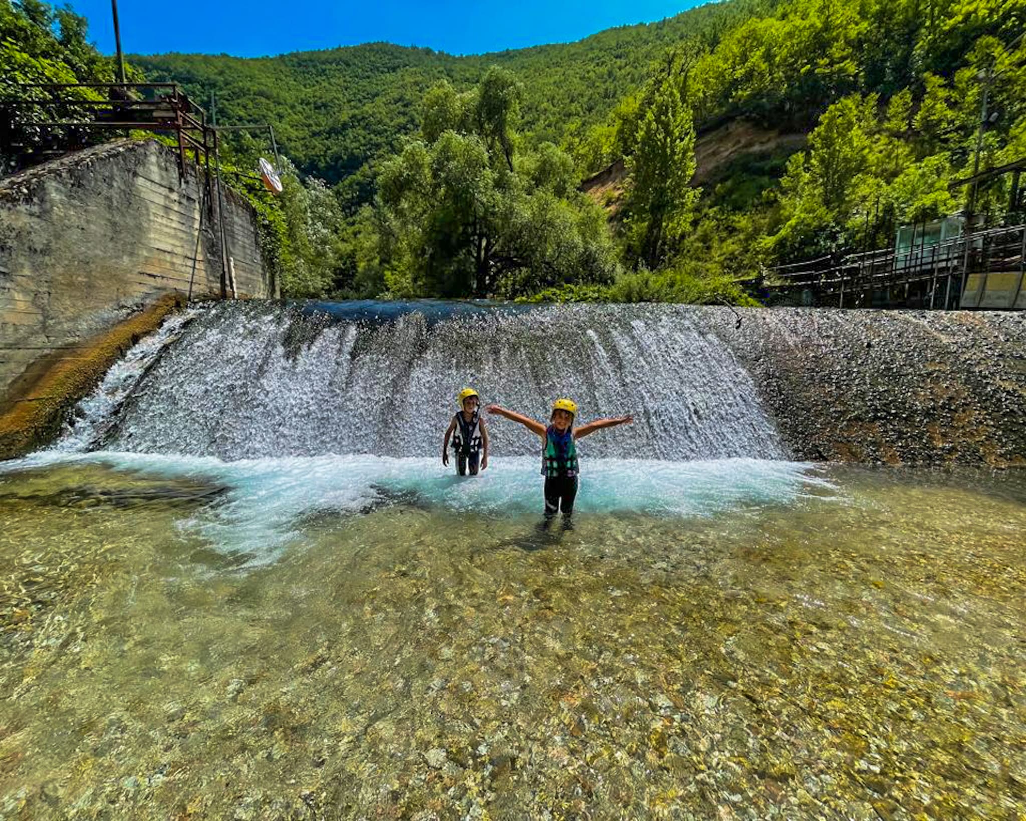 Poco dopo aver superato le gole di Biselli si continua sul fiume Corno tra scenari di rara bellezza, fino ad arrivare ad un avventuroso scivolo d’acqua, una cascata artificiale dove il gommone scende in maniera vertiginosa mettendosi quasi in posizione verticale. Un salto adrenalinico verso la fine del primo percorso di rafting, che qui si conclude in uno specchio d’acqua bassa dai colori turchesi.