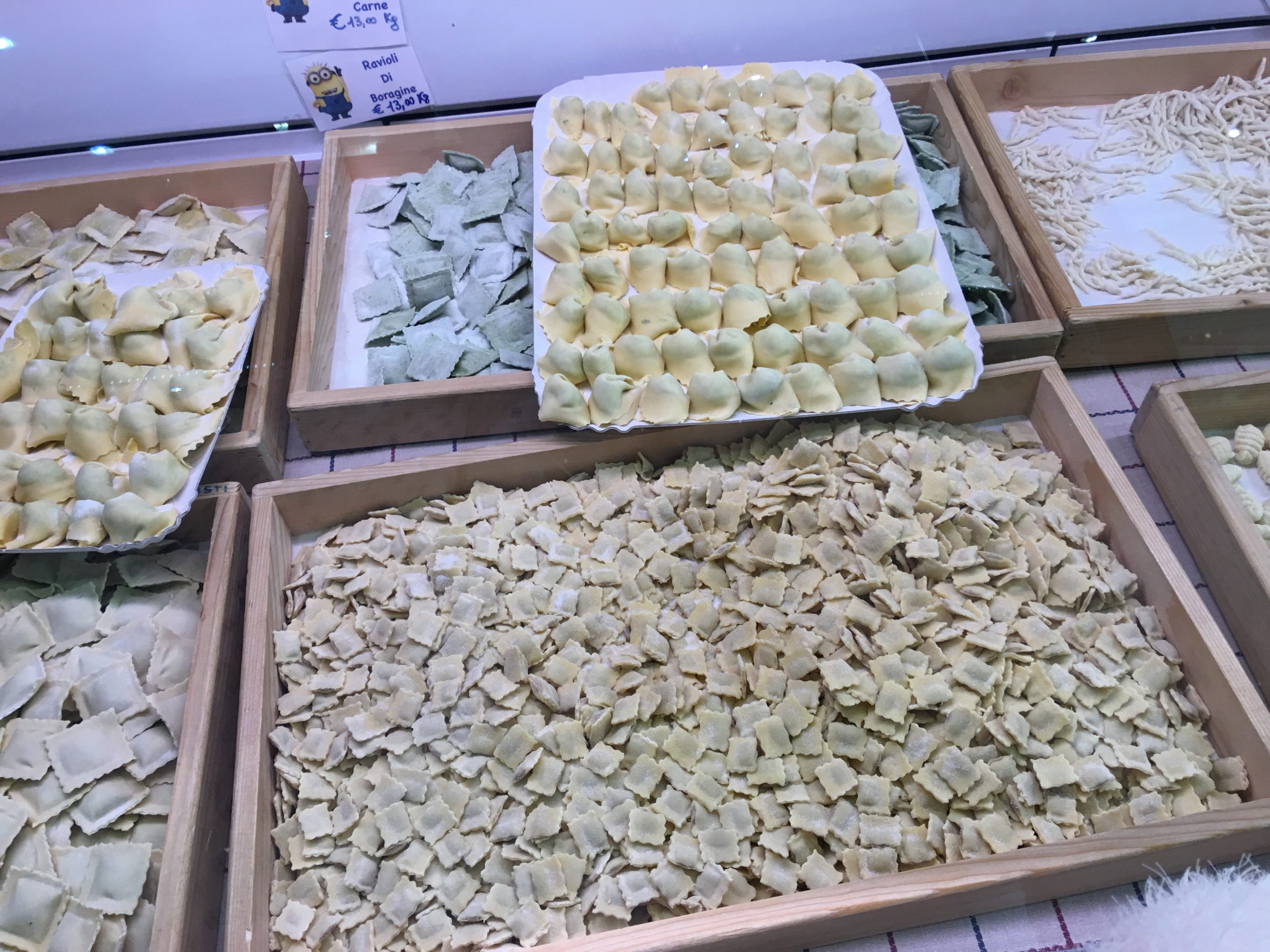 Una delle specialità gastronomiche di Rapallo sono i pansotti alla salsa di noci. I pansotti sono un tipo di pasta fresca con la sfoglia molto sottile, quasi impalpabile, riempita di ricotta e spinaci, Sono fatti a mano uno ad uno e puoi vedere come vengono prodotti in ogni pastificio della città, dove vengono preparati a vista del cliente, Nei pastifici inoltre trovi già le salse pronte con cui condirli, come la salsa di noci o il pesto ligure. Se non hai la possibilità di cucinarli da te affacciati comunque in questi laboratori per vedere il lavoro certosino che svolgono i pastai durante la preparazione della pasta fresca. Allo stesso modo vengono preparati anche altri formati di pasta, come le famose trofie liguri.